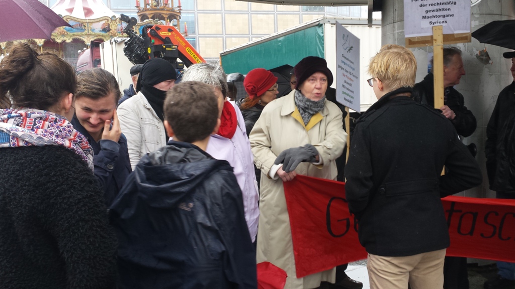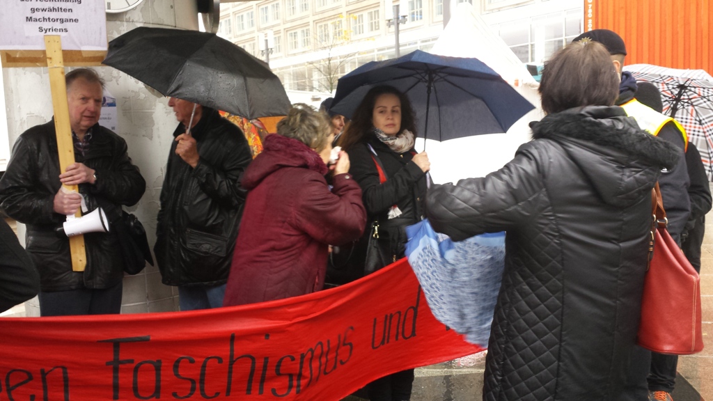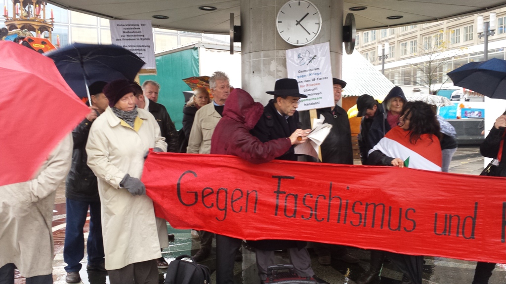 Bilder von der Demontration gegen Krieg und Faschismus am Volkstrauertag am 15. November 2015 in Berlin am Alexanderplatz unter der Weltzeituhr und am Brandenburger Tor